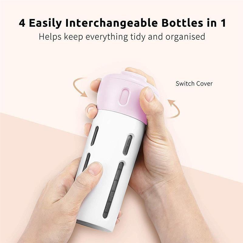 • Instantly access travel bottles. Streamline the way you stay fresh on your travels with the smart 4-in-1 Lotion Shampoo Gel Travel Dispenser! Simply rotate the top and get instant access to shampoos, conditioners, lotions, body wash, serums, hand sanitizers, and more.