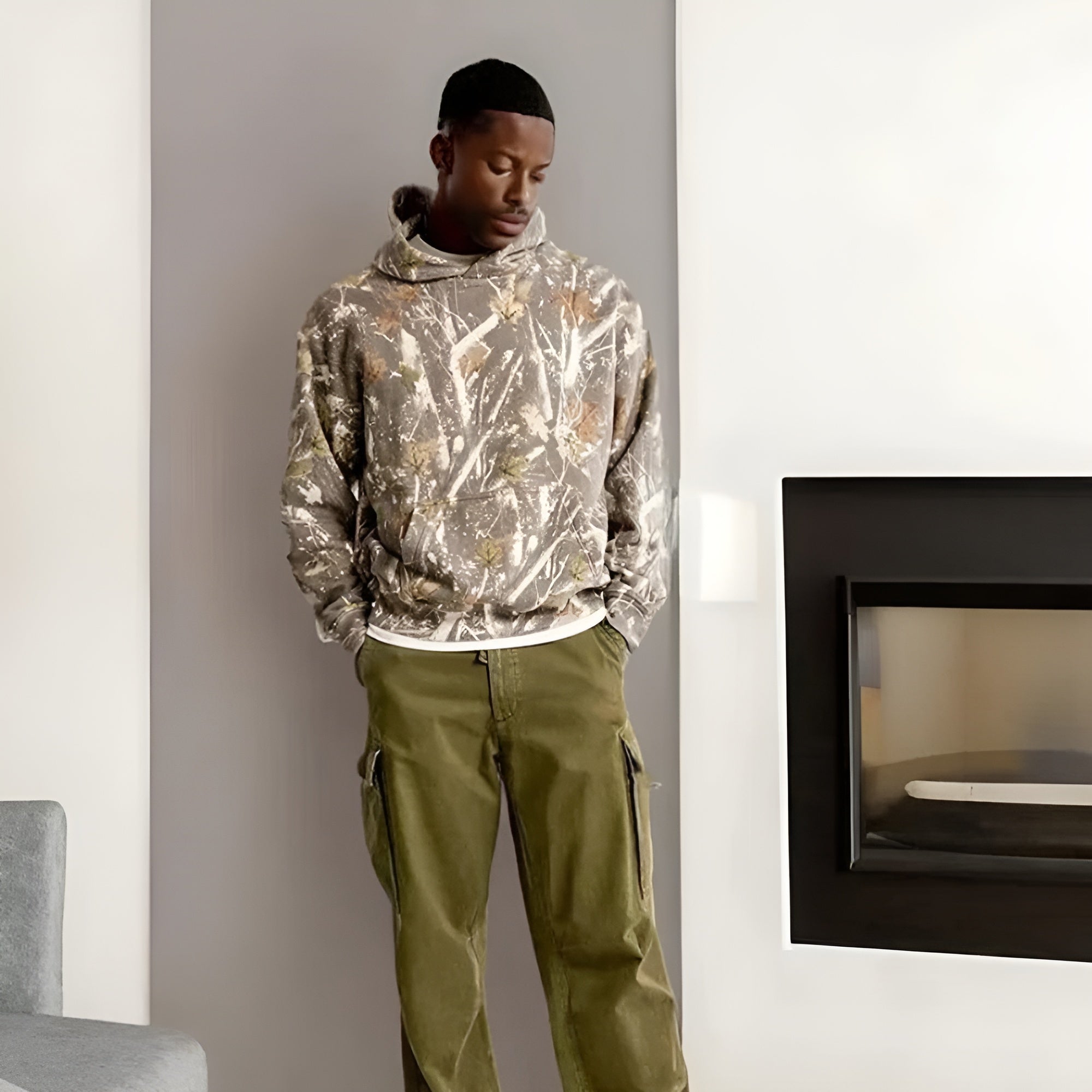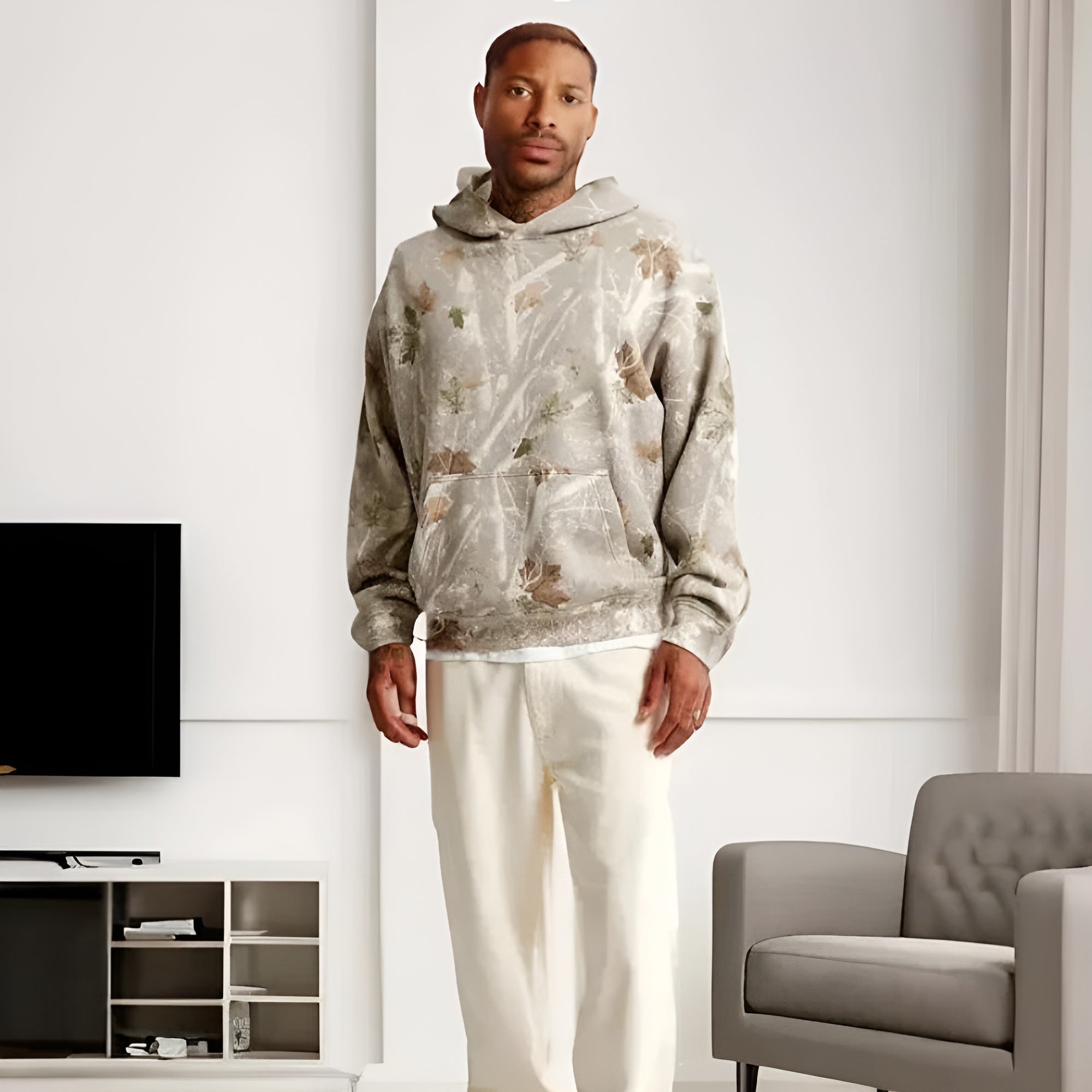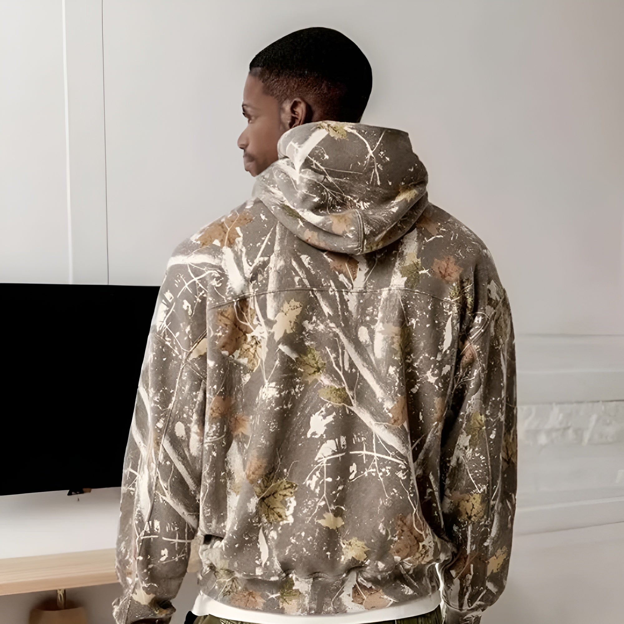 The Camo Leaf Printed Hoodie offers a perfect combination of style and functionality, ideal for those with a affection for the outdoors. Its unique design features a twist on traditional camouflage with a leafy pattern, creating a natural and earthy aesthetic. The color scheme includes forest greens, earthy browns, and touches of autumnal oranges and yellows, evoking the atmosphere of a walk through a sunlit forest.