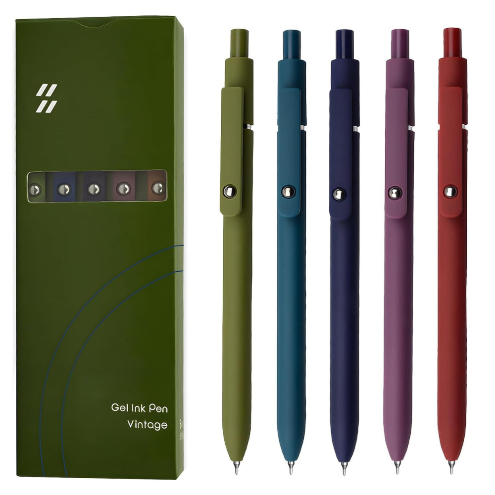 This set of Retractable Stationery Set Of Soft Matte Finish Gel Ink Pens is built to improve writing efficiency and desk organization. Designed with a smooth click-top and soft texture, these pens are crafted for accuracy and consistent ink flow. With five refined tones in one set, the collection balances clean lines and subtle visual detail.