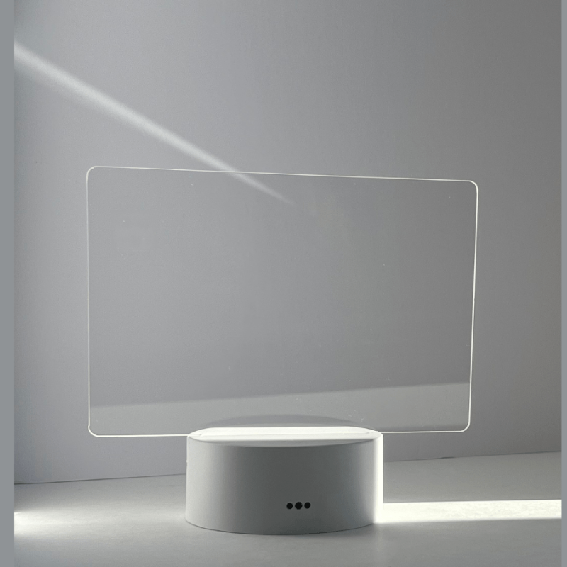 This Note Lamp horizontal and vertical version of the contemporary clear dry-erase board is available. A two-sided protective film is applied to both before shipping. The acrylic message board is clear and free of scratches. The acrylic sheet brashly emits the same color light as the lamp holder changes color.