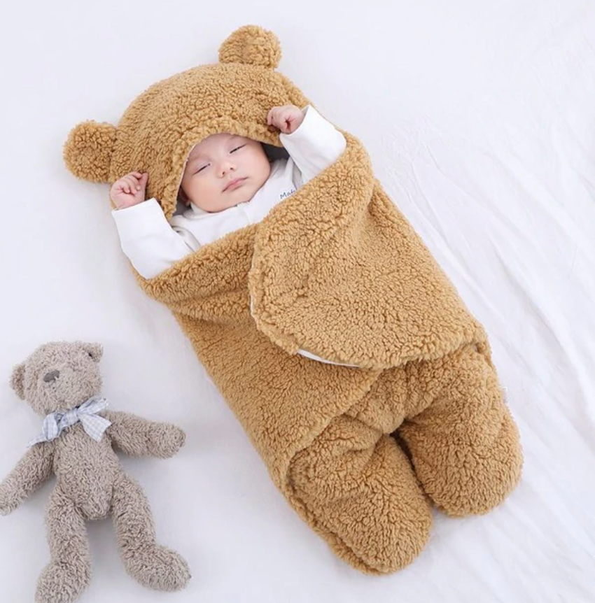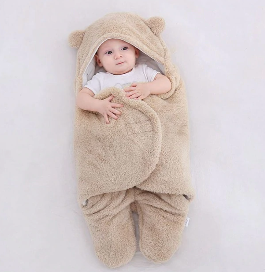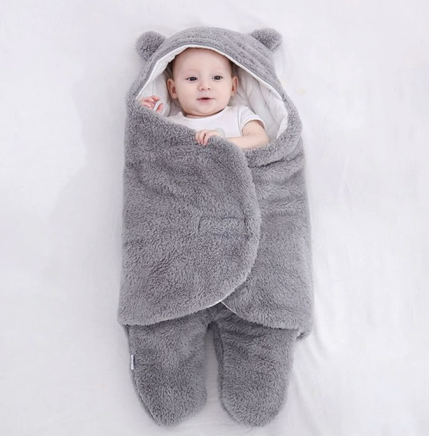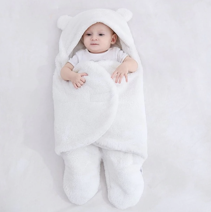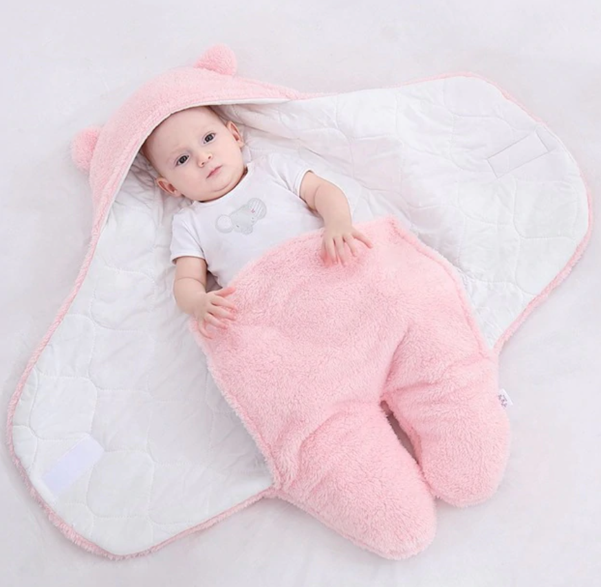Fluffy Fleece Soft Baby Sleeping Bag Swaddle Made from quality polyester (60%) and Organic Cotton (40%), this ultra-soft and breathable swaddle help babies be happier and sleep longer. We’ve thought of it all! A unique double-sided flap allows for easy middle-of-the-night nappy changes. An inner arm wrap means that even the trickiest of Houdini can’t sneak out an arm in the middle of the night, plus our special Velcro is designed to be extra quiet. This Fluffy Fleece Soft Baby Sleeping Bag Swaddle is the perfect gift for your baby child to warm their early childhood with only love and cuddles!